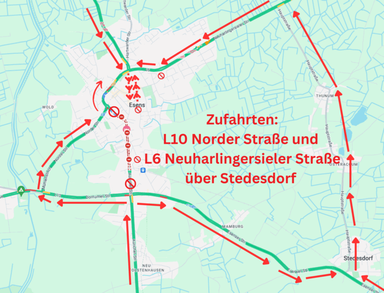 Bitte informieren Sie sich über die aktuelle Verkehrssituation. Aufgrund einer Baustelle in der Bahnhofstraße Esens ist es notwendig, den Umleitungsschildern Richtung Stedesdorf oder Holtgast zu folgen. Eine Anfahrt ist über die Bahnhofstraße ist nicht möglich.